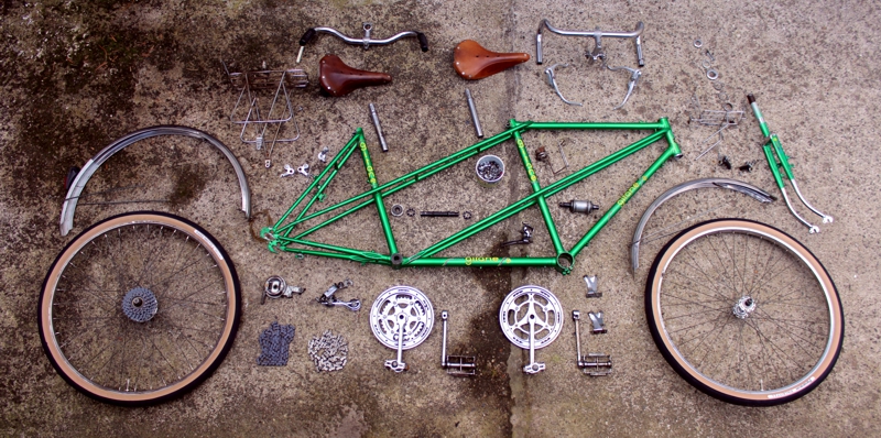 Das Thema "klassisches Renntandem" war nach der Gitane natürlich nicht vom Tisch und die Freude war groß, als wir die Tandem-Version einer Gazelle Champion Mondial fanden (Bj. 1982). Das Rad war ziemlich verbastelt, aber der Rahmen war gut und ohne große Schäden. Die originalen Galli-Komponenten habe ich alle auf dem Gebrauchtmarkt finden können. Bei den Laufrädern habe ich ein bisschen getrickst und bessere Komponenten und vor allem Räder mit 40 Speichen gewählt. Damit hat man der starken Belastung etwas entgegenzusetzen, die Holländer schien das damals nicht sonderlich zu interessieren.