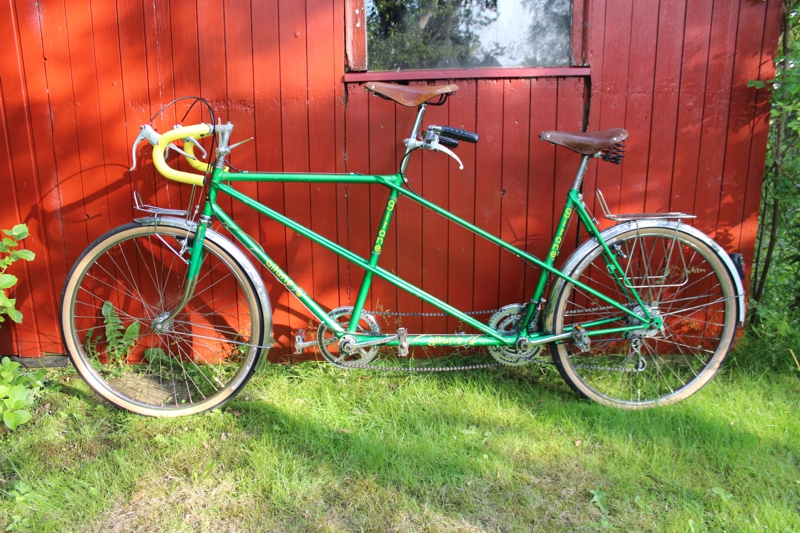 Dieses Tandem von Gitane war ein schwerer Prügel. Der Rahmen war zwar bocksteif, aber auch entsprechend schwer. Lackschäden waren bei der Flamboyant Lackierung kaum zu beheben. Über den silbernen Metallic-Lack war eine Lage transparentes Grün lackiert. Auch wenn der Lack damit einen tollen Tiefeneffekt hatte, man bekam den Ton nie hin. Schwierig waren auch das sehr spezielle, französische Felgenmaß von 26 1 1/2". Zum Glück paßten moderne 27,5" Mäntel relativ gut. Wir haben mit der Gitane an der Veloclassico Tour teilgenommen, sie inzwischen wieder verkauft, da sie einfach zu klein war.