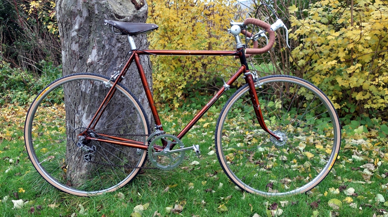 Das älteste Rad aus meinem Stall (1973) und deshalb auch das komplizierteste. Ersatzteile für diese Räder werden schon schwierig zu bekommen und manche Maße sind wirklich speziell. Die Räder haben das Maß 27x1 1/4", seeeehr speziell. Auch die Lackierung ist wieder eine Flamboyant Lackierung und entsprechend "unreparierbar". Soweit ich es herausfinden konnte, hat damals Gazelle Räder für Raleigh gebaut, daher die charakteristischen Sattelstreben, die um das Sattelrohr laufen.